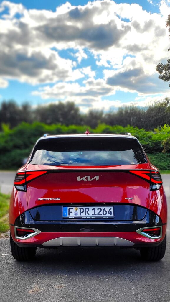 Der vordere Stoßfänger ist robust gestaltet und ist mit Lufteinlässen versehen, die sowohl die Aerodynamik verbessern als auch für eine sportliche Optik sorgen. Die Silhouette des Sportage ist dynamisch und fließend, mit einer leicht ansteigenden Dachlinie. Der von uns getestete Sportage stand auf 19 Zoll-Reifen. Die Fensterlinie ist elegant gestaltet und ist mit Chromakzenten versehen, was dem Fahrzeug eine Premium-Anmutung verleiht.