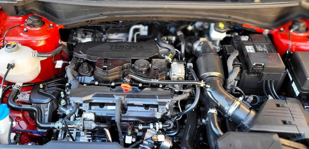 Der von uns getestete Kia Sportage bietet eine moderne und effiziente Antriebslösung, die sowohl Leistung als auch Umweltfreundlichkeit in den Fokus stellt. Er ist mit einem 1,6-Liter-Turbobenzinmotor ausgestattet, der die moderne T-GDI-Technologie (Turbo Gasoline Direct Injection) nutzt. Diese Technologie sorgt für eine verbesserte Kraftstoffeffizienz und reduzierte Emissionen. Der Motor leistet 118 kW (ca. 160 PS).