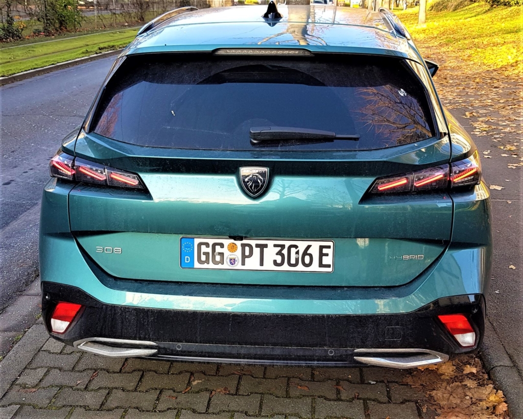 Ein 1,6 – Liter – Vierzylinder – Benziner arbeitet im 308 SW Hybrid 225 e-EAT8. Dieser entfaltet 133 kW / 181 PS. Weitere 81 kW / 110 PS steuert der Elektromotor hinzu. Zusammen wird eine Systemleistung von 165 kW / 225 PS erzielt. Den Strom liefert eine Lithium-Ionen-Batterie der Kapazität 12,4 kWh. Die Abkürzung “EAT8“ im Namen steht für das Achtstufenautomatikgetriebe. Bei unserer Testfahrt haben wir rein elektrisch gefahren 63 Kilometer geschafft. Mit einer Fahrweise überwiegend im Hybrid-Modus beläuft sich der Kraftstoffverbrauch auf etwa 3,2 Liter / 100 km/h. Der Kombi-Löwe erreicht aus dem Stand heraus nach 7,7 Sekunden die 100 km/h-Marke und ist bis zu 225 km/h schnell.