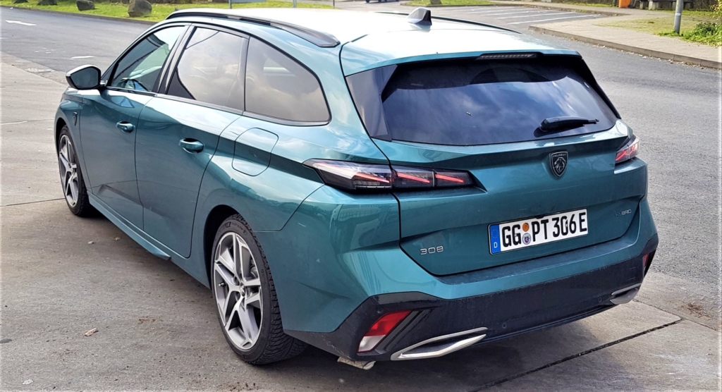 Drei Fahrmodi stehen zur Auswahl: Sport, Eco und Hybrid. Das entspannte Cruisen ist die Stärke des Franzosen. Des Weiteren gibt es die Möglichkeit, den e-Save-Modus zu nutzen, mit dem sich elektrische Reserven für später aufsparen lassen. Eine extrastarke Rekuperation kann über die „B“-Taste aktiviert werden. Selbst bei flottem Autobahntempo bleibt der 308 angenehm ruhig. Die Geräuschdämmung ist perfekt. Die Fahrwerksabstimmung ist im richtigen Maße straff und bügelt Unebenheiten im Asphalt gut aus. Auch der Federungskomfort stimmt voll und ganz. Durch das kleine Lenkrad macht es Spaß, durch Kurven zu fahren. Engagiert und agil zeigt sich der Kombi, wenn es mal schneller voran gehen soll. Das Temperament des Antriebs hat uns sehr gut gefallen. Weiterhin darf man sich über eine Reihe an Fahrassistenten erfreuen, zu denen beispielsweise ein Adaptivtempomat zählt, der das jeweils geltende Tempolimit übernehmen und automatisch den Abstand zum Vordermann halten kann. Auch der Ausparkassistent mit Querverkehrswarner oder die Rückfahrkamera mit 360-Grad-Perspektive machen das Fahren einfacher.